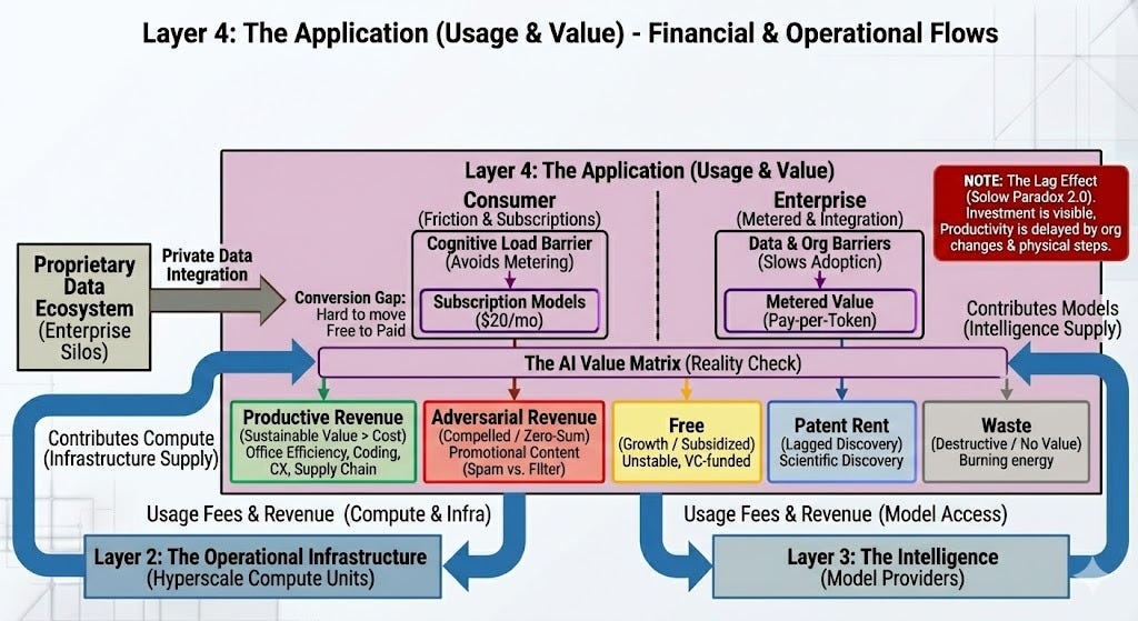 As we look forward, the specific tasks—the “Use Cases”—will define which segment wins and how much of that massive investment in lower layers can actually be recouped. In my next post, we will dive deeper into the Activity Value Matrix to see exactly where this “productive revenue” is hiding, how the shapes of use cases shift between consumer and enterprise, and where energy is simply being burned as “waste.”