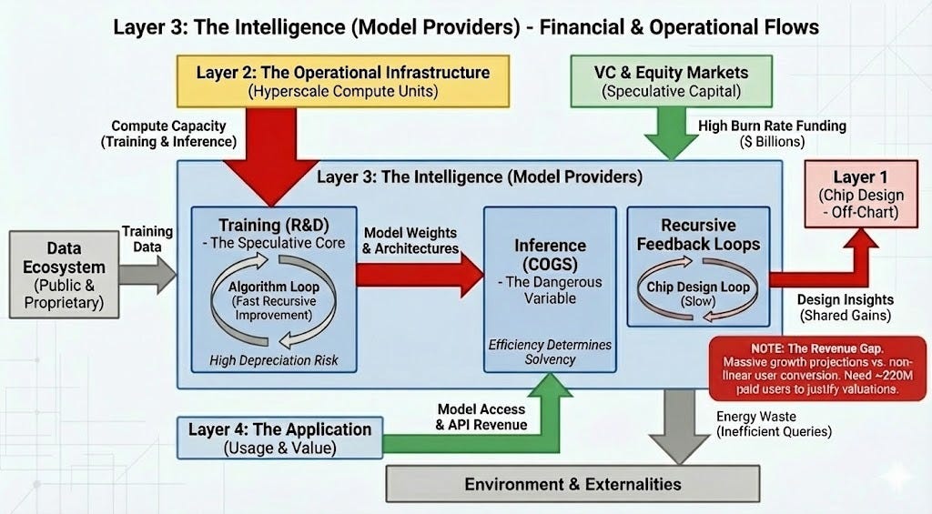 The Intelligence (Layer 3) is precarious. Only a fraction of spending is covered by revenue; the remainder is funded by investment capital and debt, driven by high optimism. While capital costs are not as high as Layer 2, they are still high, and so are operational costs. Almost all this goes to Layer 2 as current revenues. Cash flow is negative and dependent on ongoing investment, while also being highly competitive.