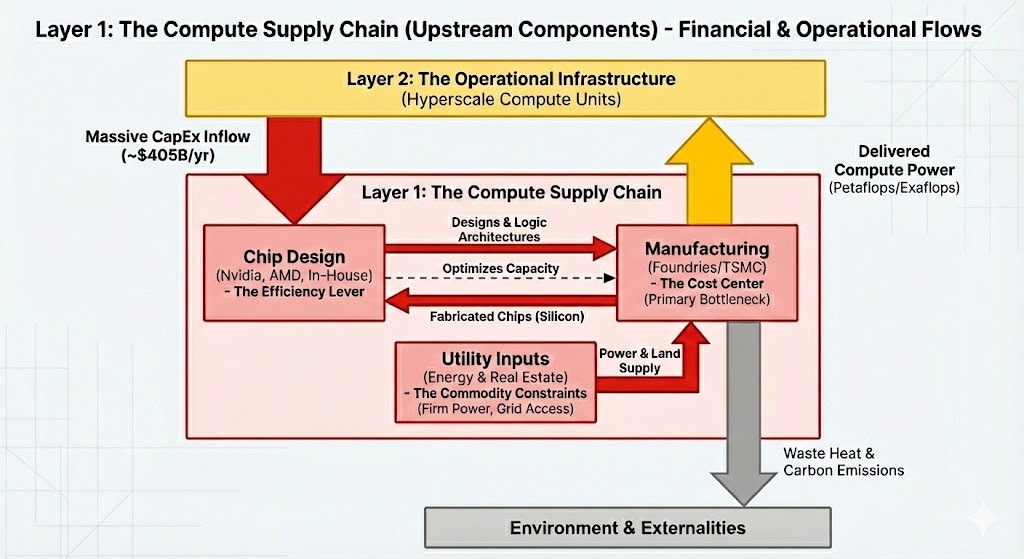 Surrounding this is the often-overlooked constraint of utility inputs: energy and real estate. All compute requires reliable power, making grid access a key determinant of land value.