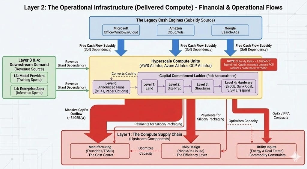 Sitting directly above the supply chain is the Operational Infrastructure, defined by the delivered compute. This layer efficiently deploys chips using existing cash flows, and keeps them operational. Very CapEx dependent, but so far, self-financing. The primary examples are the hyperscalers: AWS, GCP and Azure. These companies are absorbing the massive AI infrastructure costs using cash flows from mature, non-AI businesses like search and retail. A full accounting must consider smaller providers and private deployments.